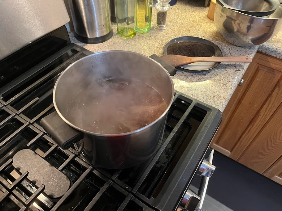 After simmering, turn off the heat, add the tea, and let it steep, then strain.